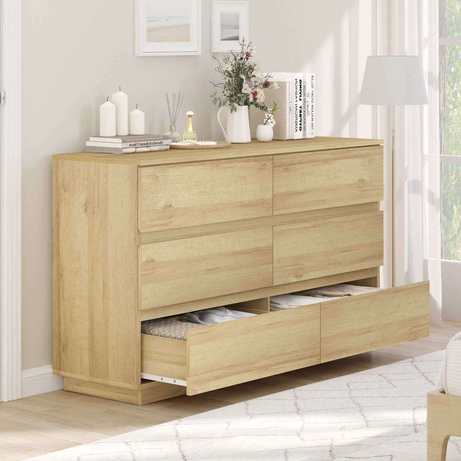 With six generously sized drawers, clearing the clutter and keeping your clothes, linens, or toys neatly tucked away has never been easier. Plus, the sturdy top surface is perfect for displaying your favorite photos, plants, or a bedroom TV!