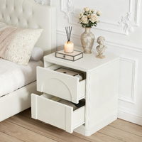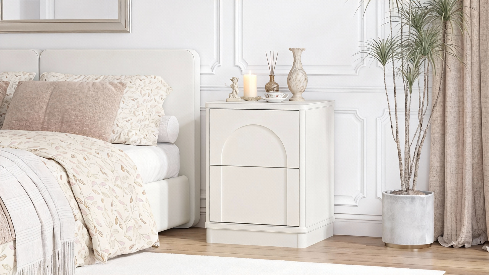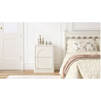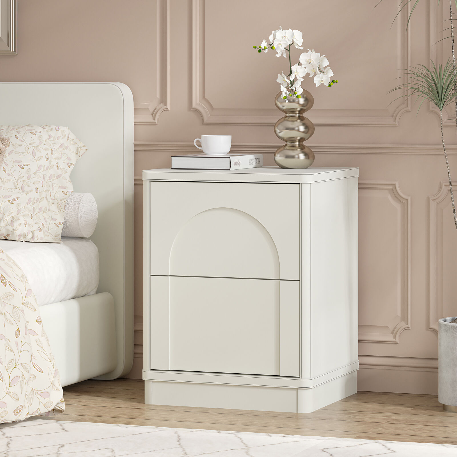The 2-drawer design of this exceptional bedside table stands out with distinct charm: the upper drawer features a curved arch on its front, boasting soft and elegant lines, while the lower drawer adopts a neat rectangular design—together, they create a overall silhouette that is neat and structured. The edges of the cabinet are adorned with exquisite decorative lines, which add a sense of layering and sophistication, enhancing the texture and spatial presence of this exceptional bedside table piece.
