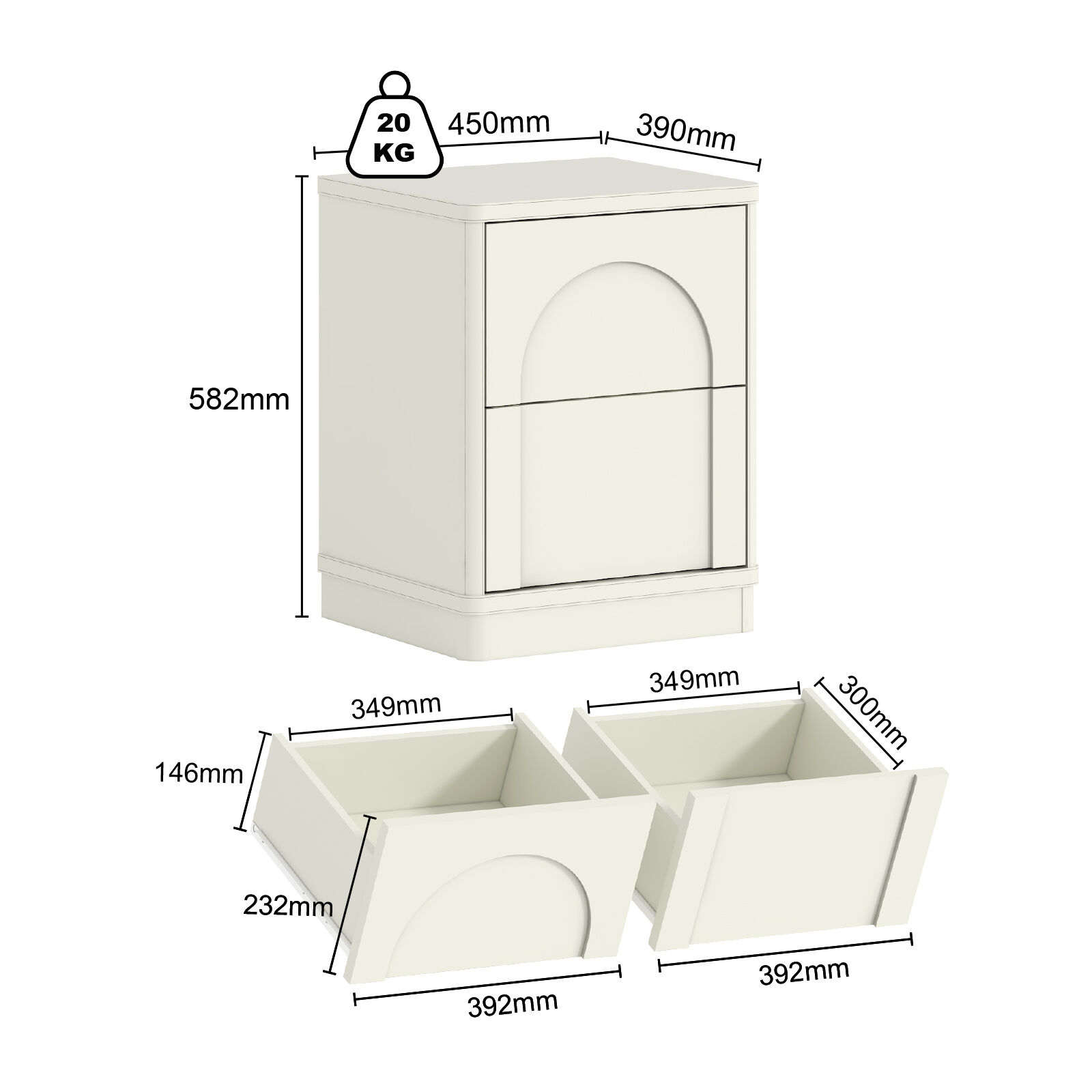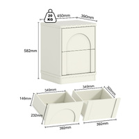 • Practical Structure: 2 drawers (curved upper/rectangular lower) + flat top for display/storage.