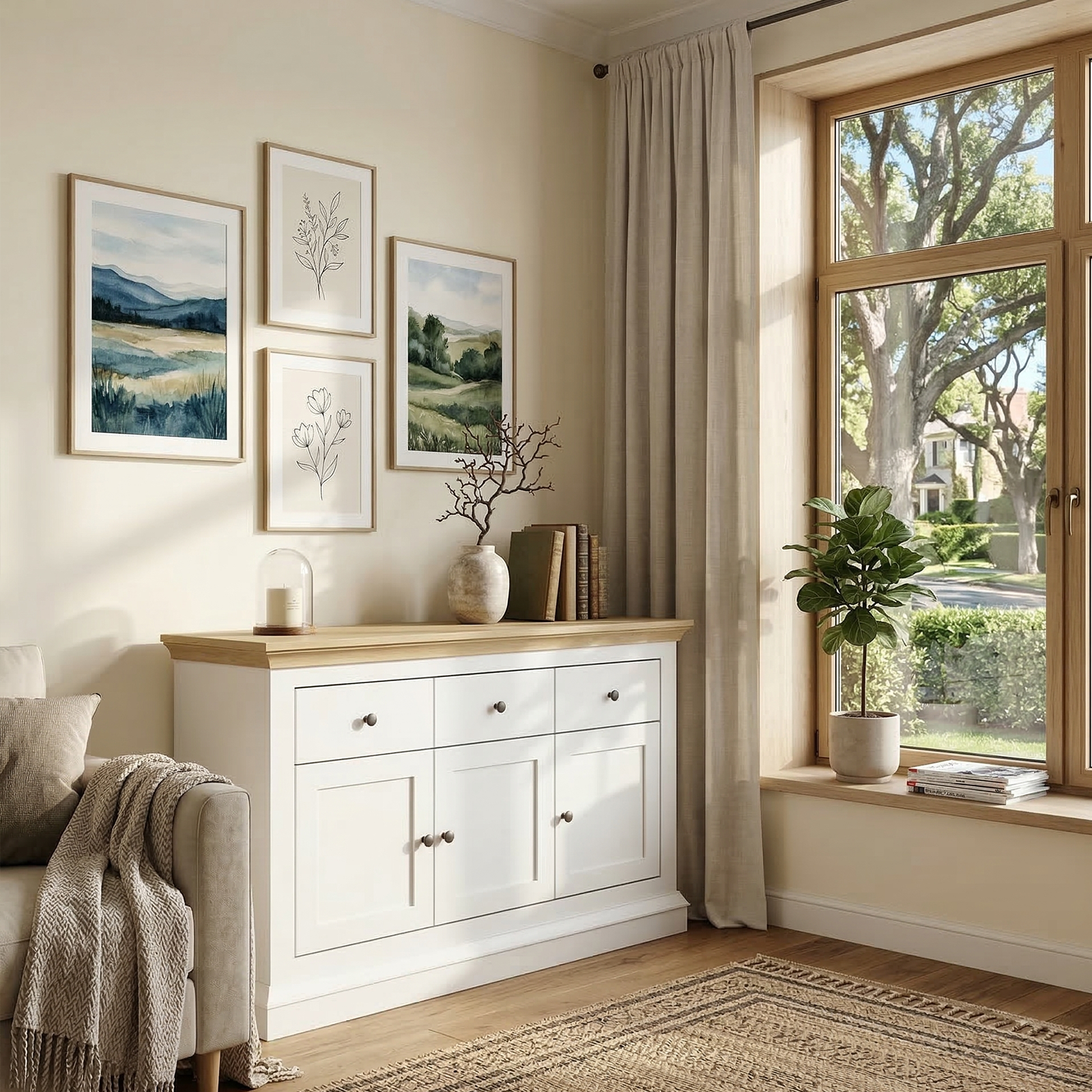 Embrace the timeless charm of the coast with our signature Hamptons Sideboard. Perfectly balancing traditional farmhouse silhouettes with a fresh, airy aesthetic, this piece is designed to be the heart of your dining or living space. The crisp white body, contrasted by a warm, natural oak-look top, evokes a sense of relaxed luxury found in Australia’s finest seaside homes.