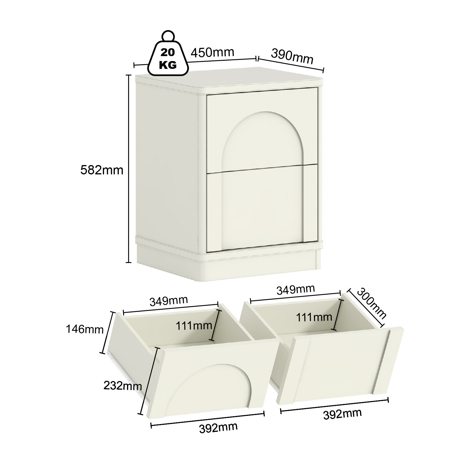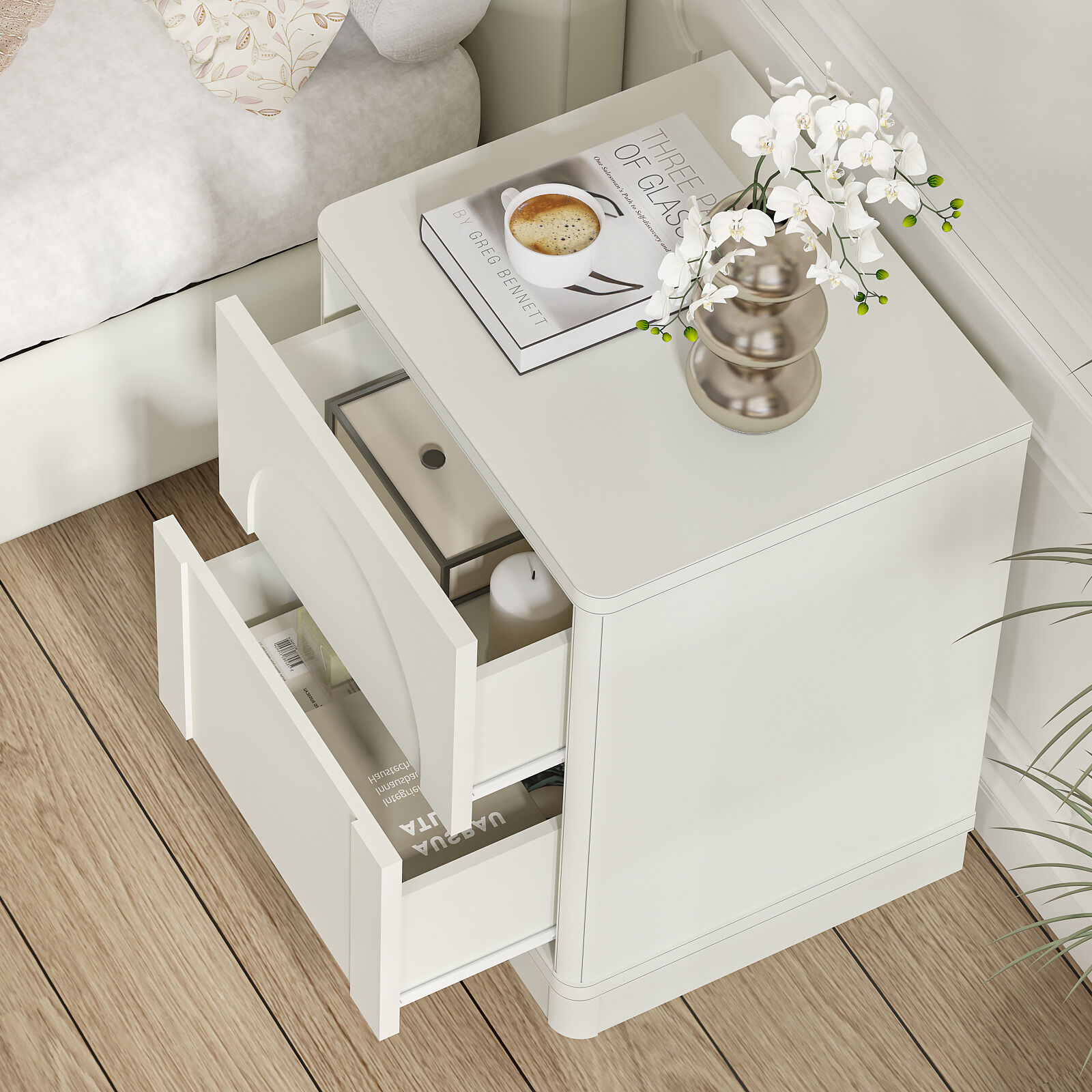 The chest of drawers features eight spacious, smooth-gliding drawers for organized storage and a wide top surface for decorations and cosmetics. The bedside table combines minimalist and retro-inspired details, with curved and rectangular drawer fronts, refined trim, and a clean white finish that adds elegance and depth to your space.