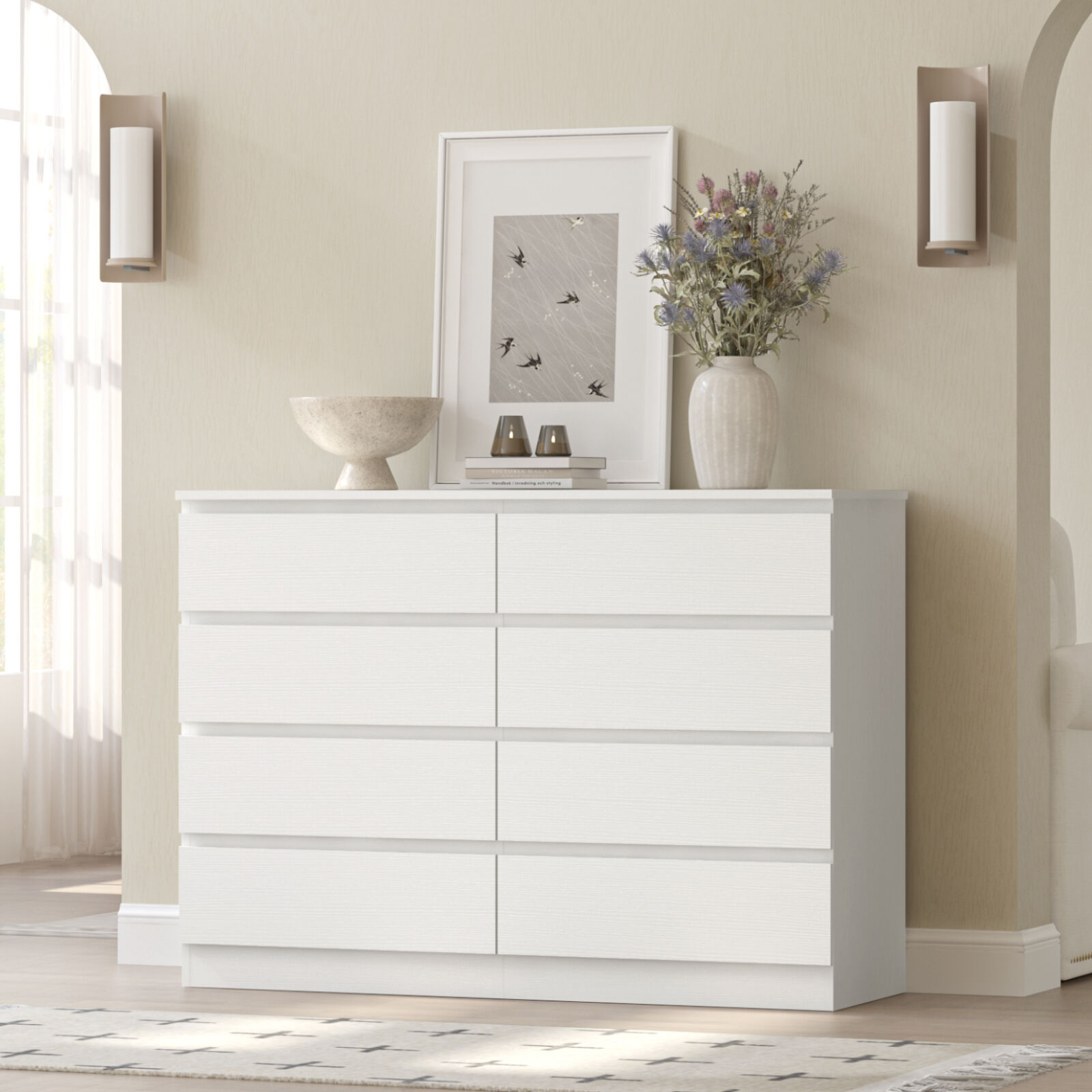 Enhance your bedroom with elevated style and function. This combo of two White 8-Drawer Chests of Drawers is a standout set that offers eight spacious, smooth-gliding drawers per chest for effortless organization, plus wide tops ideal for displays. Affordable and practical, this combo of two chests of drawers includes assembly guides—upgrade now to enjoy their fresh elegance.​