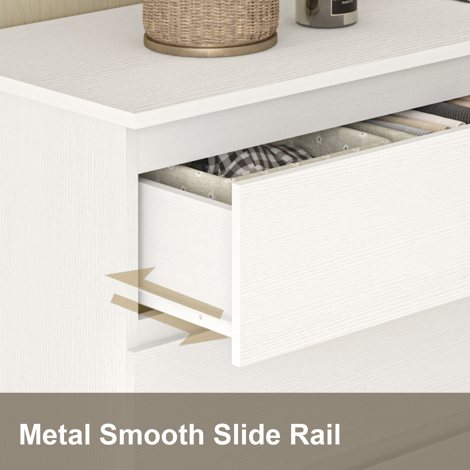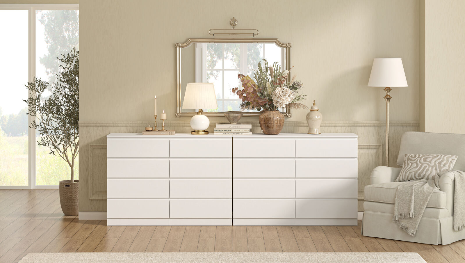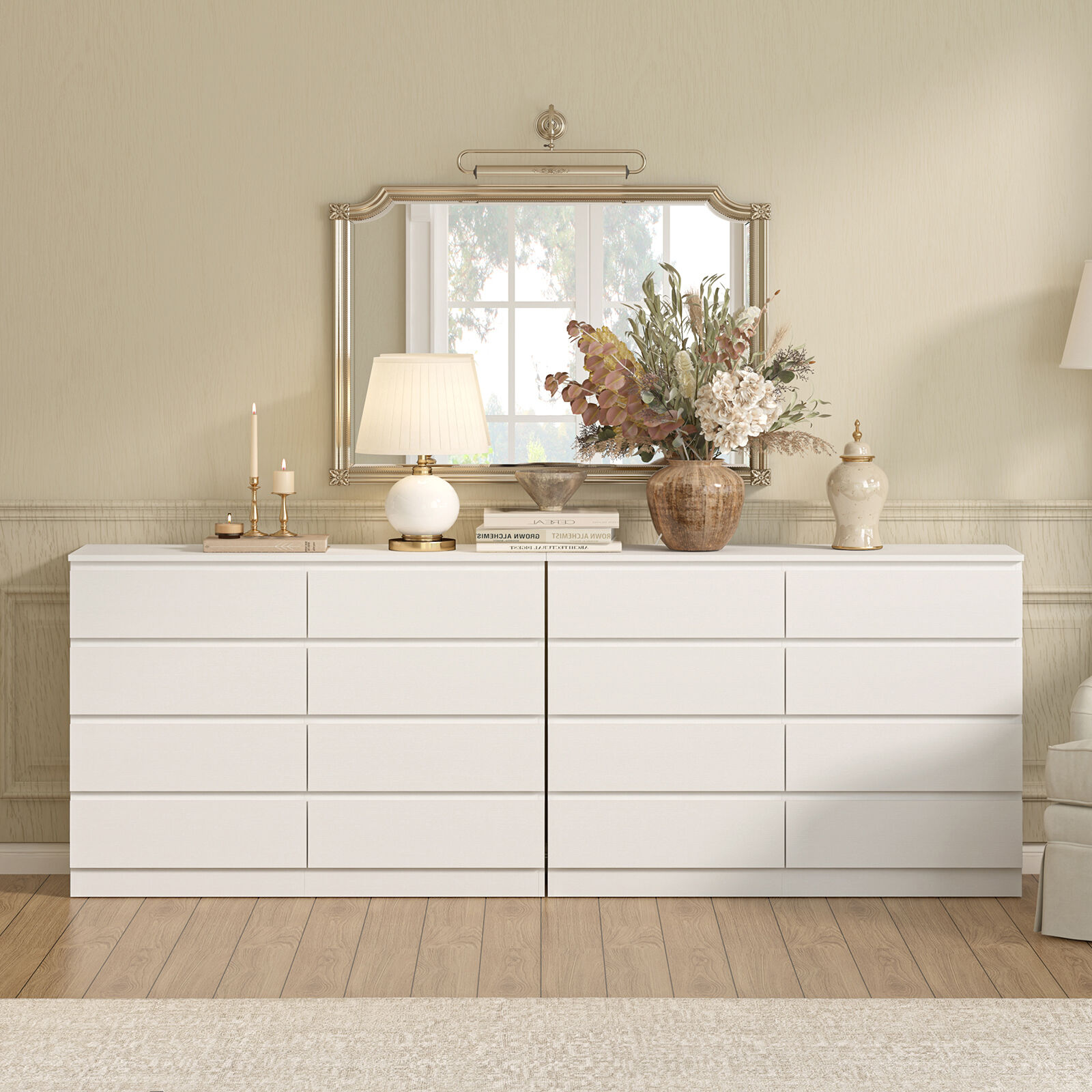 Featuring eight spacious drawers each, this combo of two chests of drawers provides ample storage space to keep items neat and accessible—with drawers gliding open effortlessly for quick, user-friendly access. Their wide top surfaces also double as display areas for favorite decorations, cosmetics, or accessories, blending practicality with decorative potential for truly useful chests of drawers.​