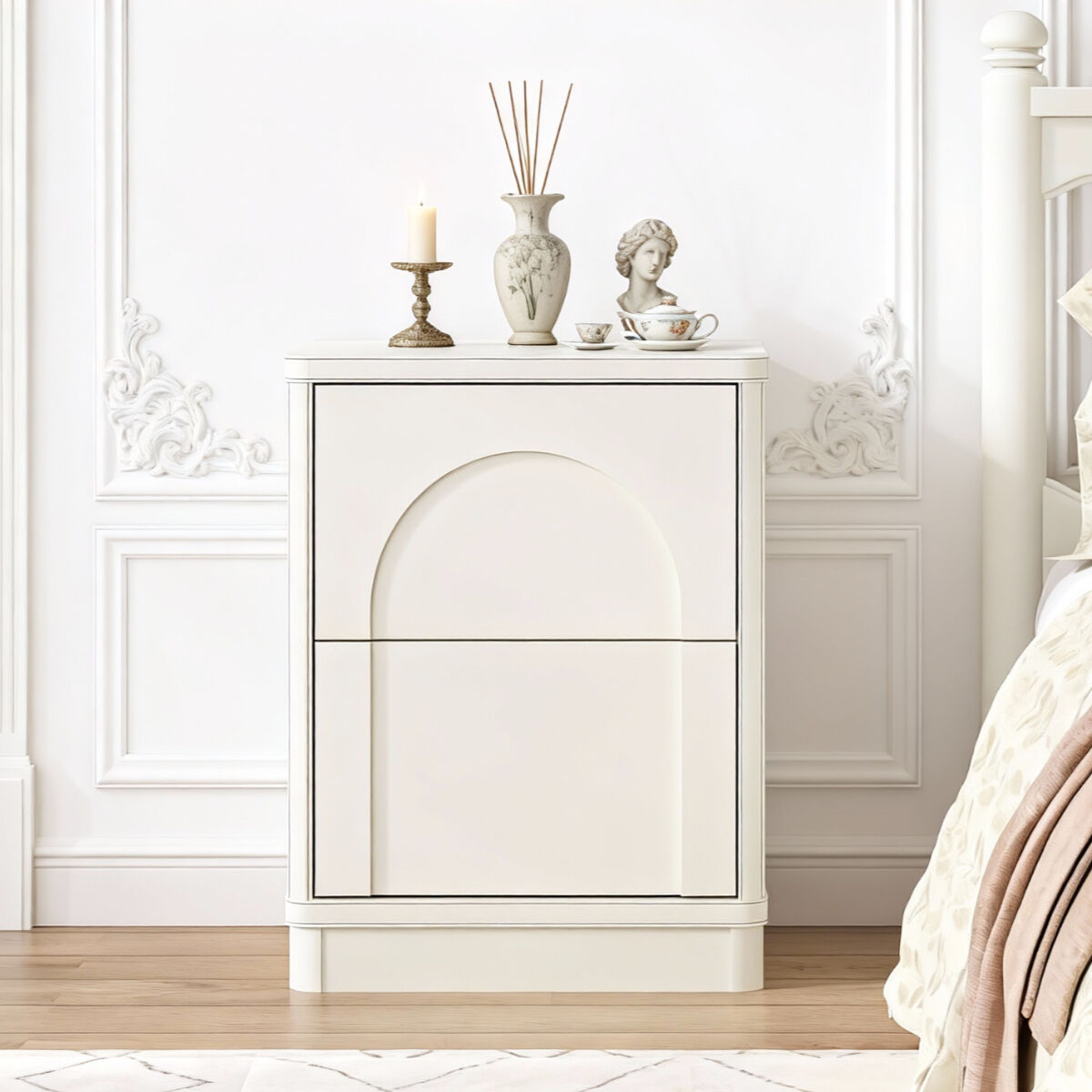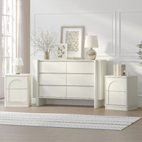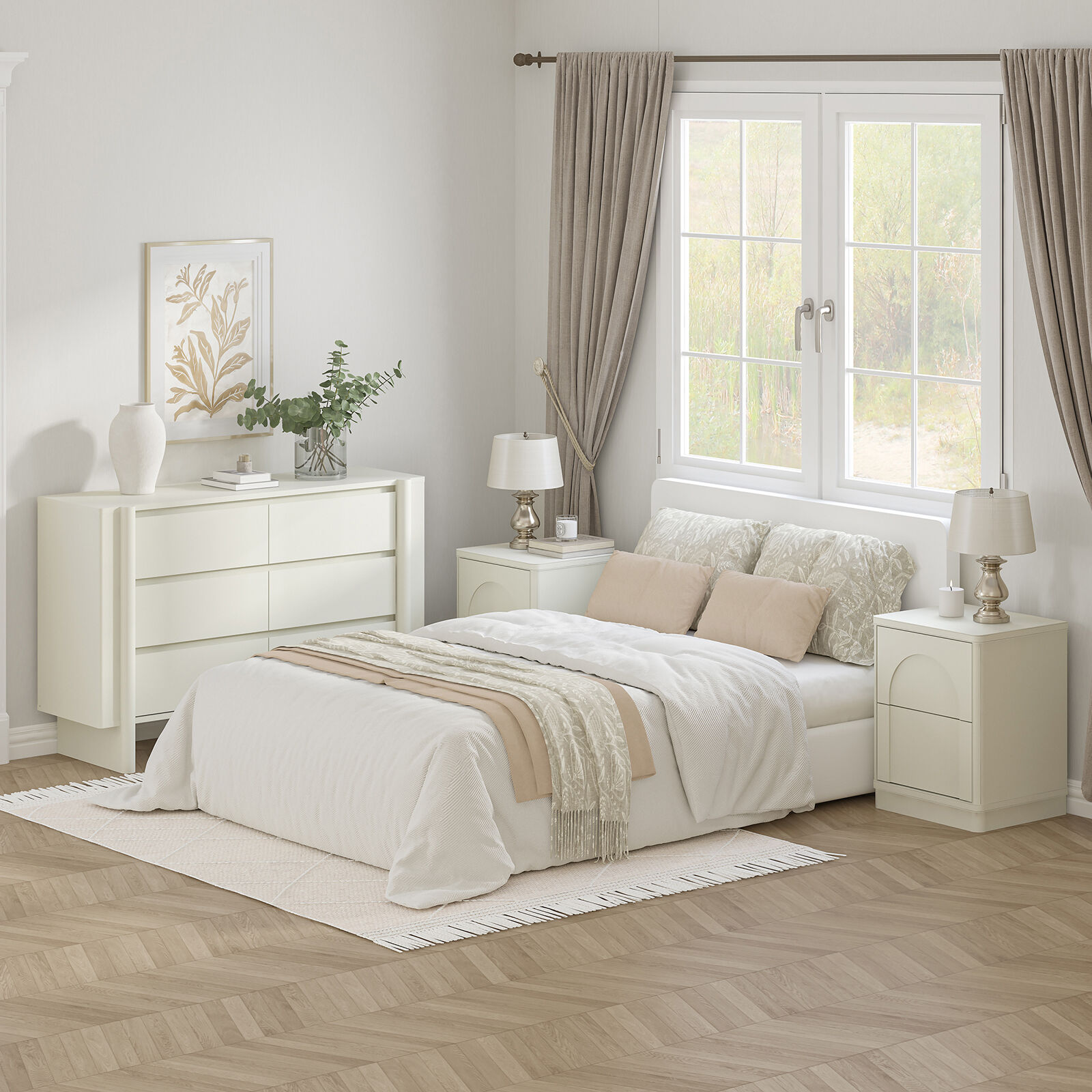 The chest of drawers features a symmetrical 3-row, 6-drawer layout for ample storage of clothes, accessories and daily essentials. Each nightstand comes with a 2-drawer design (curved arch upper drawer + neat rectangular lower drawer) for organized storage of small bedside items; exquisite decorative lines on cabinet edges boost layering and sophistication, and all pieces boast a fine, delicate surface texture.