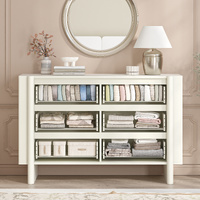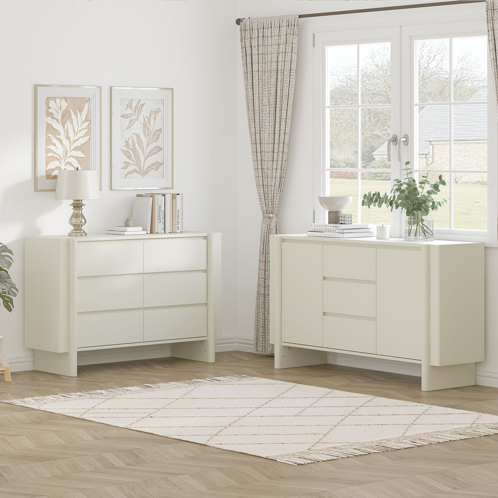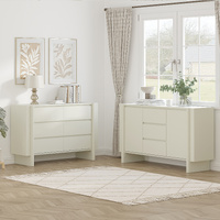 The chest of drawers in the set features a neat and symmetrical layout with three rows of drawers (six drawers in total), providing ample storage space for organizing clothes, accessories, or daily essentials, and its cabinet is accented with three-dimensional decorative frames on both sides to enhance design appeal. The matching buffet sideboard adopts a classic and practical "2-door + 3-drawer" configuration: three vertically arranged drawers in the middle offer convenient storage for small items like tableware or daily essentials, while the left and right cabinet doors provide hidden space for larger belongings such as linens or kitchen appliances. Both pieces boast a fine and delicate texture on the surface—with the sideboard crafted from smooth board material for a premium tactile experience—adding a subtle sense of refinement to the set’s overall look and perfectly balancing functional storage with aesthetic appeal.
