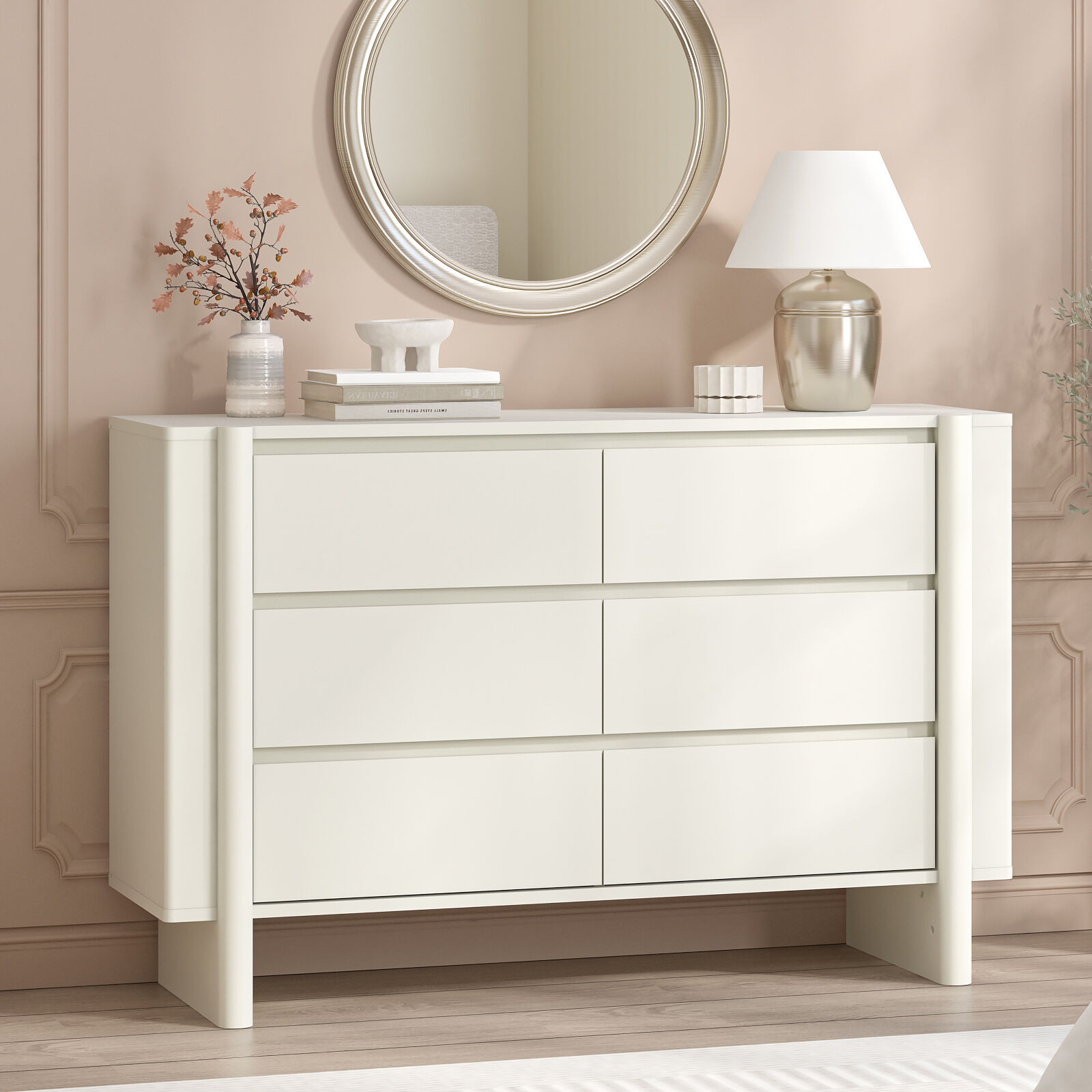 This chest of drawers features a neat and symmetrical layout with three rows of drawers (six drawers in total), providing ample storage space for organizing clothes, accessories, or daily essentials. The cabinet of this chest of drawers is accented with three-dimensional decorative frames on both sides, which enhances its design appeal, while the surface of the chest of drawers boasts a fine and delicate texture that adds a subtle sense of refinement to the chest of drawers’s overall look.