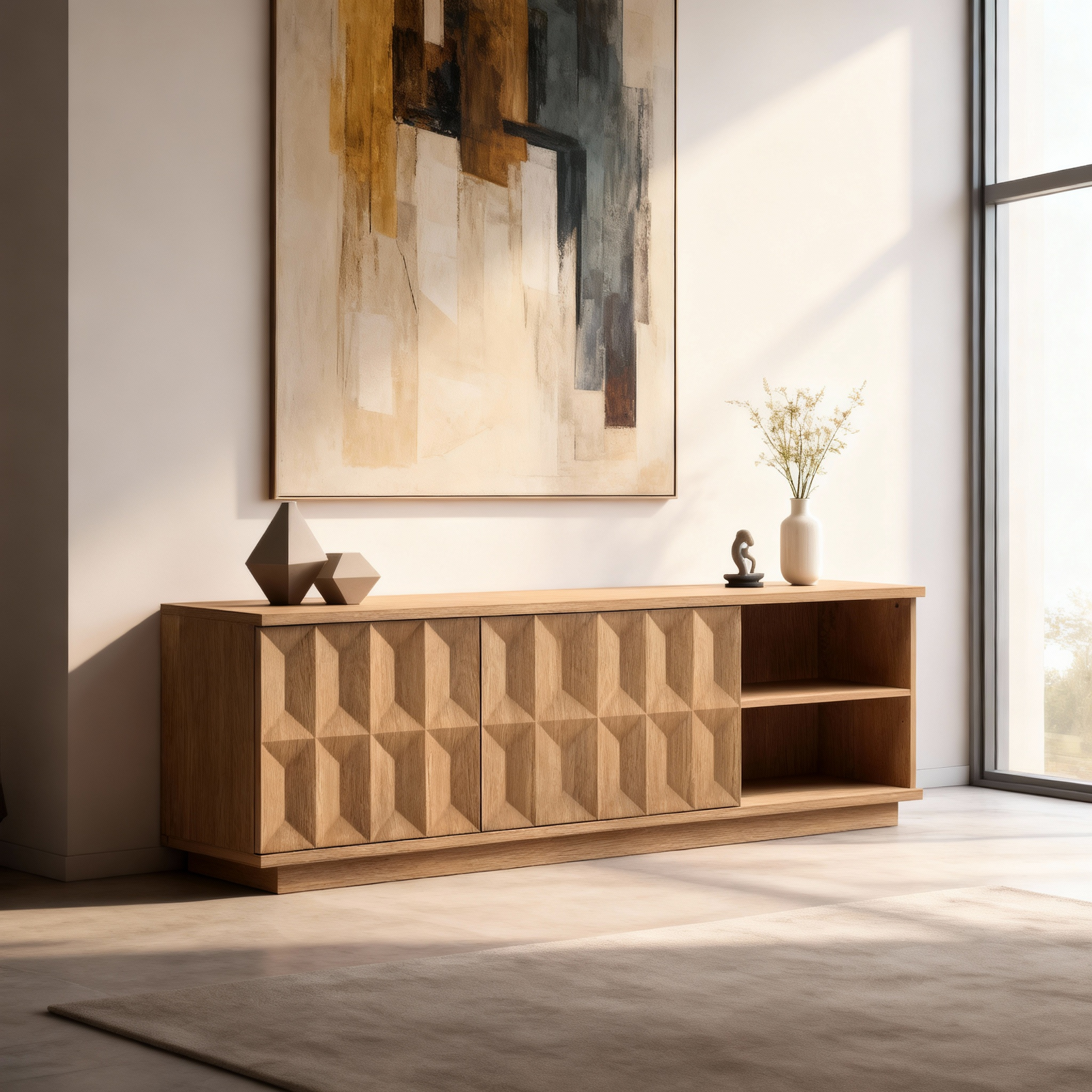 • Artistic Visual Appeal:The tv entertainment unit features a warm oak finish paired with 3D geometric cabinet paneling, adding distinctive, artistic character to any space.