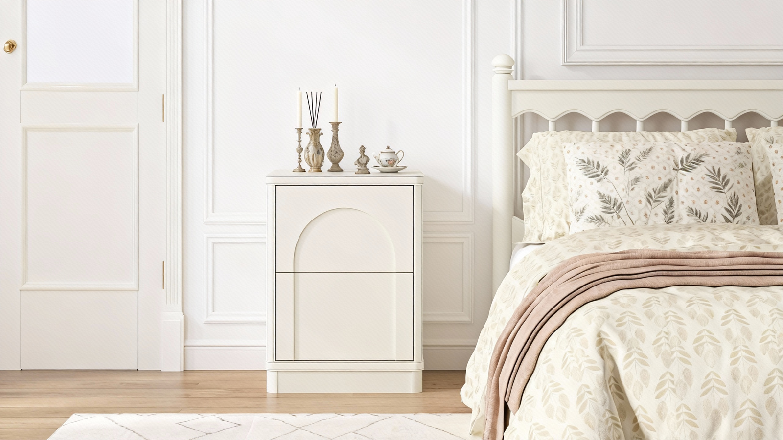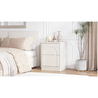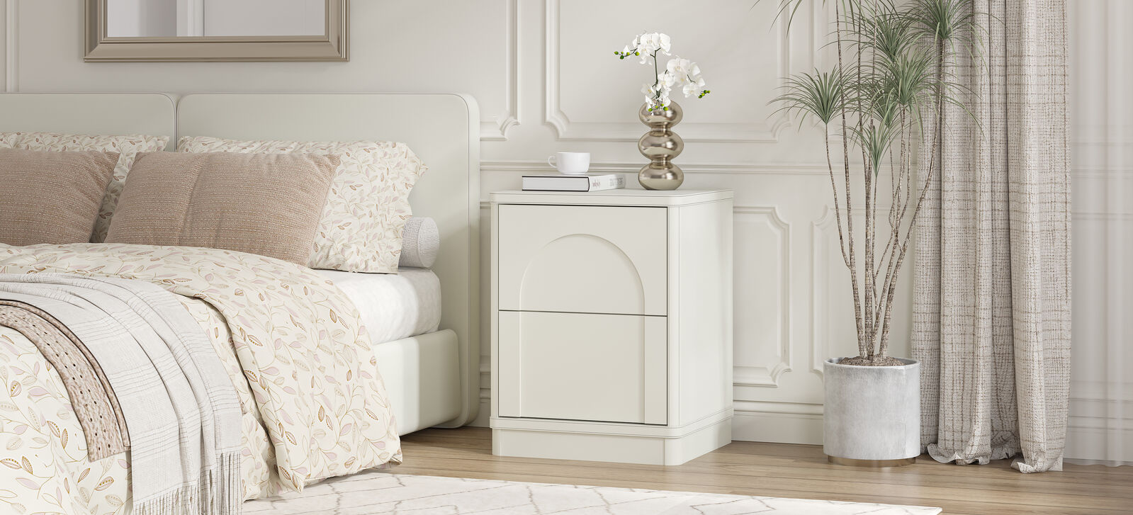 The 2-drawer design of this exceptional bedside table stands out with distinct charm: the upper drawer features a curved arch on its front, boasting soft and elegant lines, while the lower drawer adopts a neat rectangular design—together, they create a overall silhouette that is neat and structured. The edges of the cabinet are adorned with exquisite decorative lines, which add a sense of layering and sophistication, enhancing the texture and spatial presence of this exceptional bedside table piece.