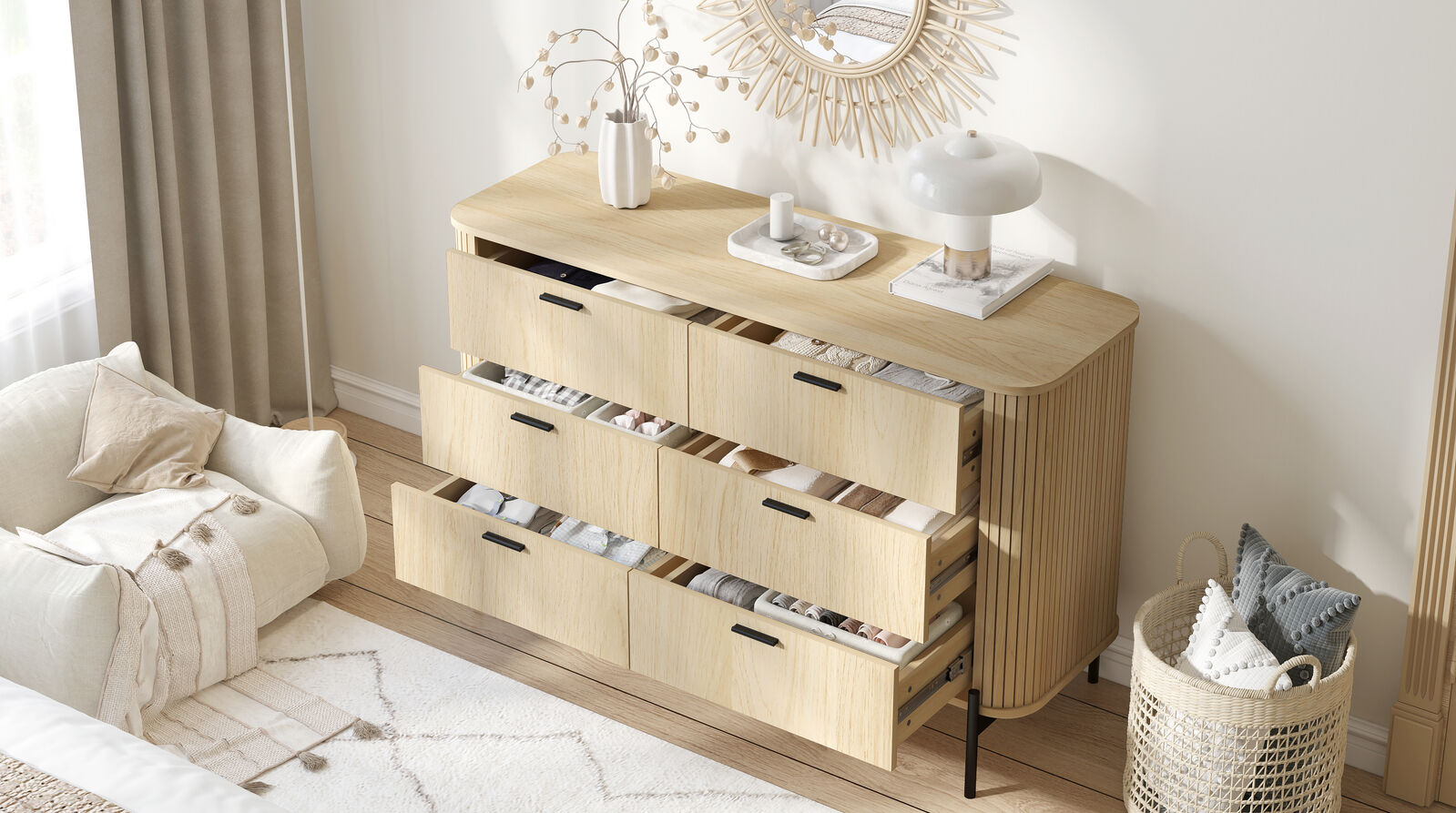 Flutia 6 Drawer Chest of Drawers Dresser Lowboy with 2 Fluted Bedside Tables Bedroom Storage Cabinet