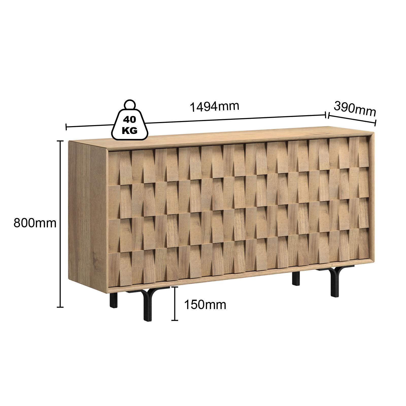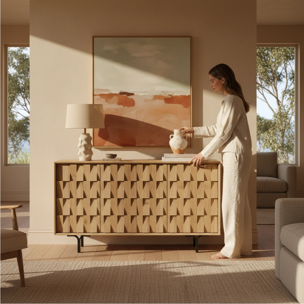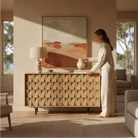 • Unique 3D Textured Design:This buffet sideboard features a handcrafted interlocking wood slat pattern, creating a dynamic, tactile visual that doubles as a high-end decorative focal point.