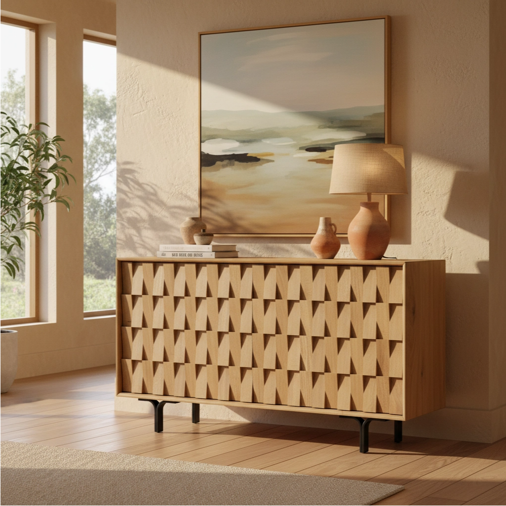 This buffet sideboard showcases a natural light wood finish paired with authentic woodgrain texture, delivering an organic, versatile look that seamlessly complements various decor styles (from contemporary to rustic). The buffet sideboard’s design balances sophistication and utility: its front features a unique 3D interlocking wood slat pattern, creating a dynamic, tactile visual that elevates the buffet sideboard from basic storage to a high-end decorative focal point. The integrated door design (blending with the slat pattern) adds a sleek, cohesive touch to the buffet sideboard, letting the textured wood details take center stage.
