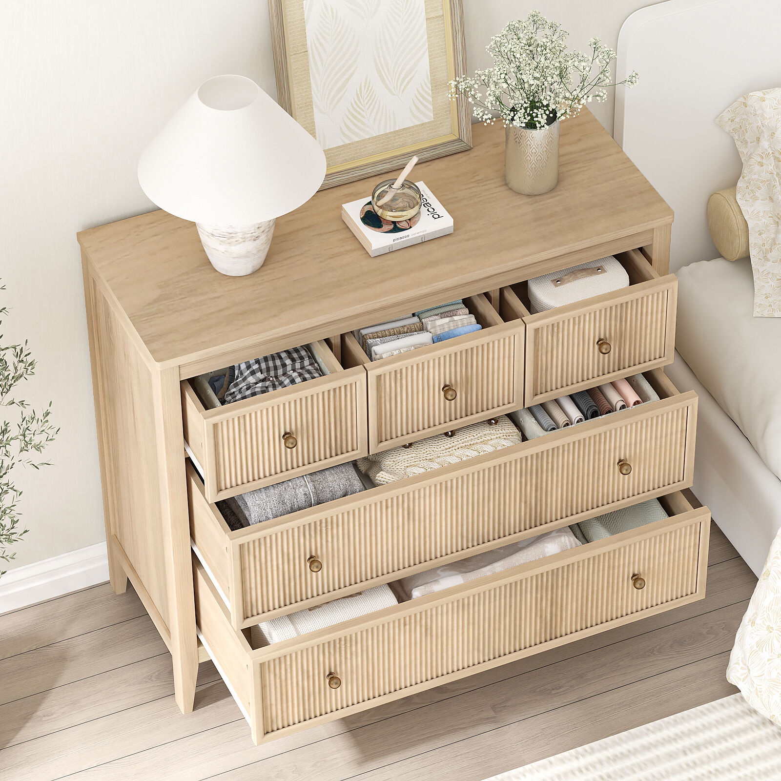 Fluted 6 Drawer Chest of Drawers Lowboy Dresser Storage Cabinet for Bedroom