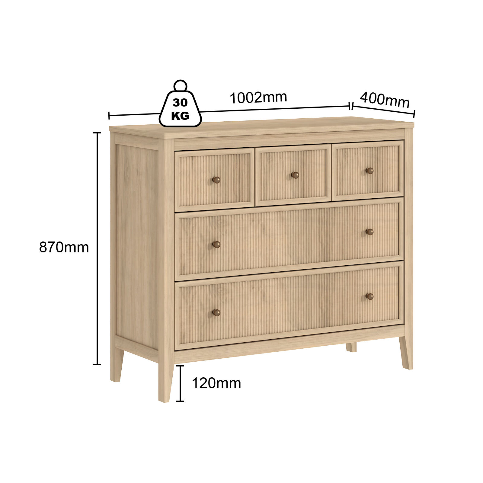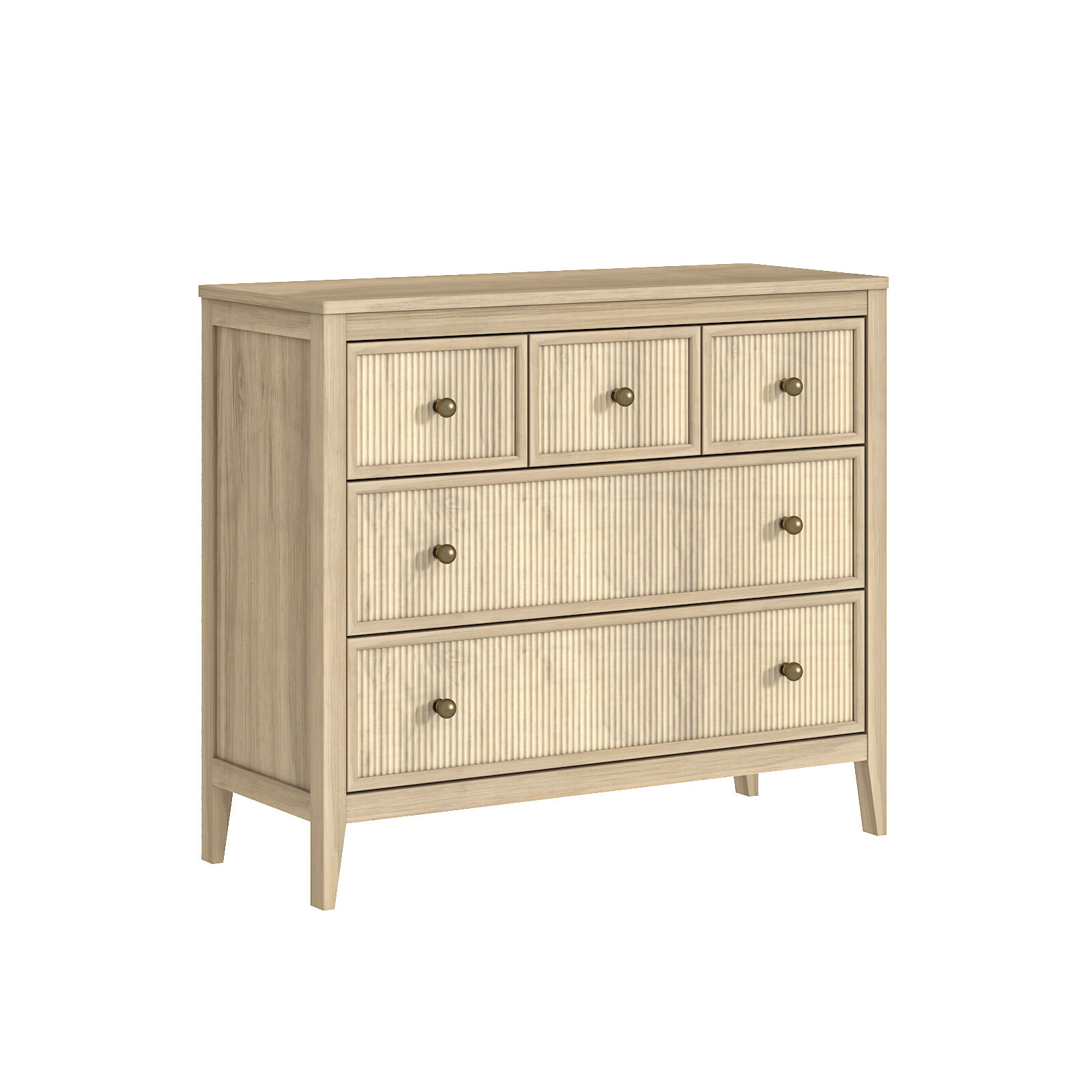 Infuse a touch of unique elegance into your living room, kitchen, dining room, or entryway with this fluted five-drawer chest of drawers. This sophisticated chest of drawers is defined by its unique fluted panel paired with wood grain texture that elevates its premium look, allowing it to seamlessly blend into a variety of home decors.​ This fluted chest of drawers features a practical "3+2" five-drawer configuration: three drawers and two drawers (arranged in a 3+2 layout) offer tiered storage space—perfect for organizing tableware, daily essentials, small kitchen tools, or linen items.