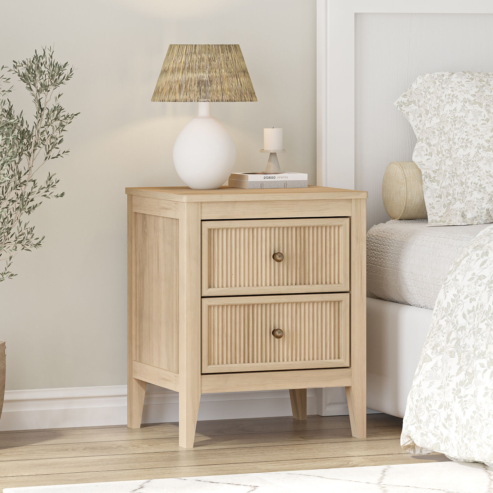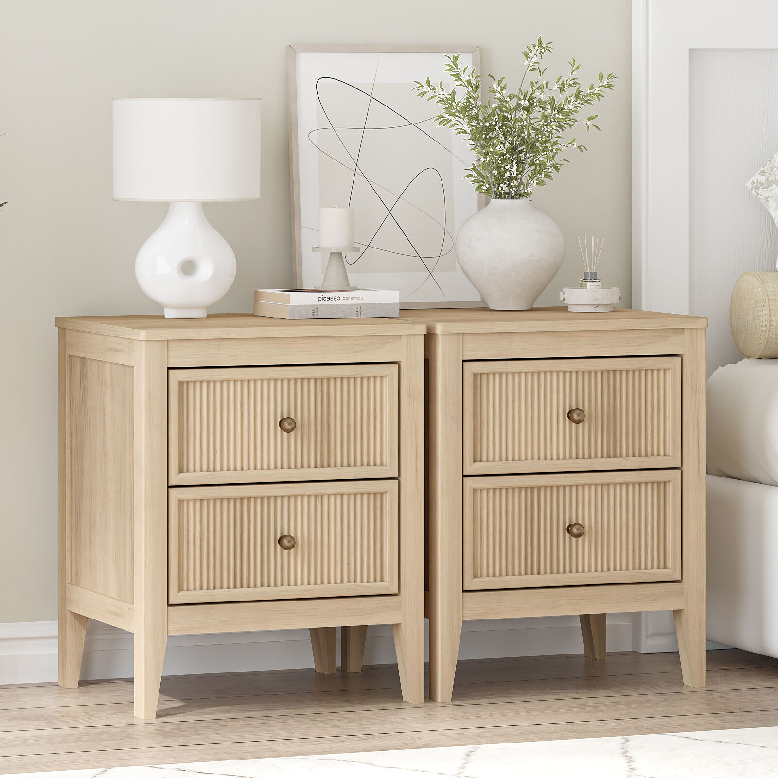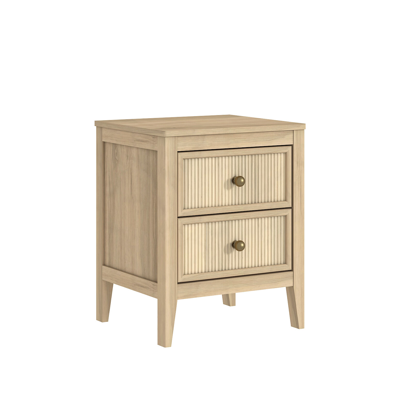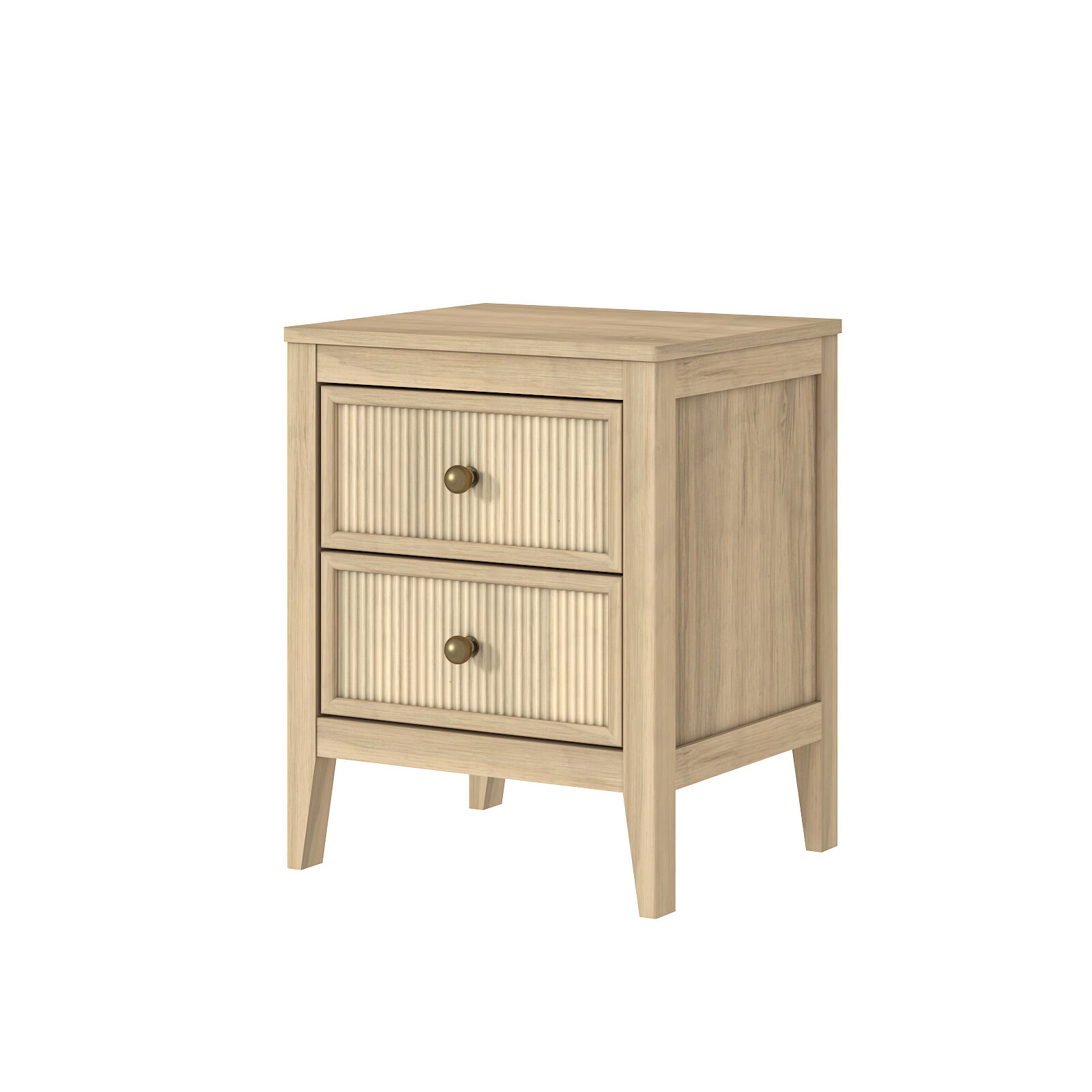 Each 2-drawer bedside table features unique vertical fluted drawer panels and brass-toned knobs, exuding elegant texture and gentle charm. With tapered legs and clean lines, this pair of bedside tables delivers cozy modern appeal, seamlessly combining aesthetics and functionality to elevate your bedroom ambiance.
