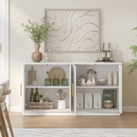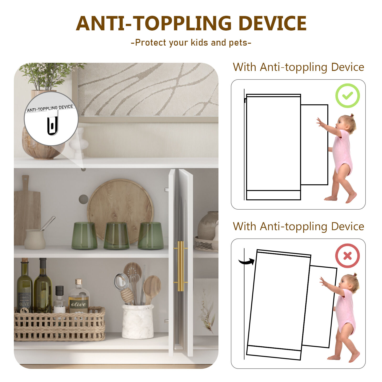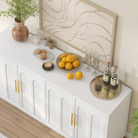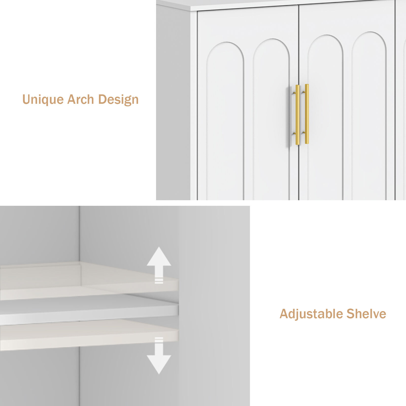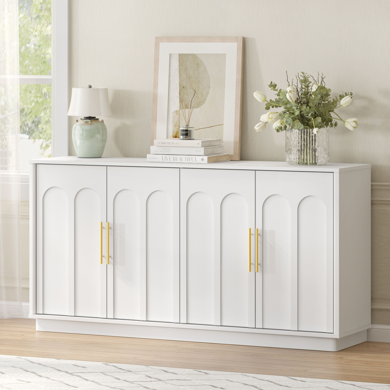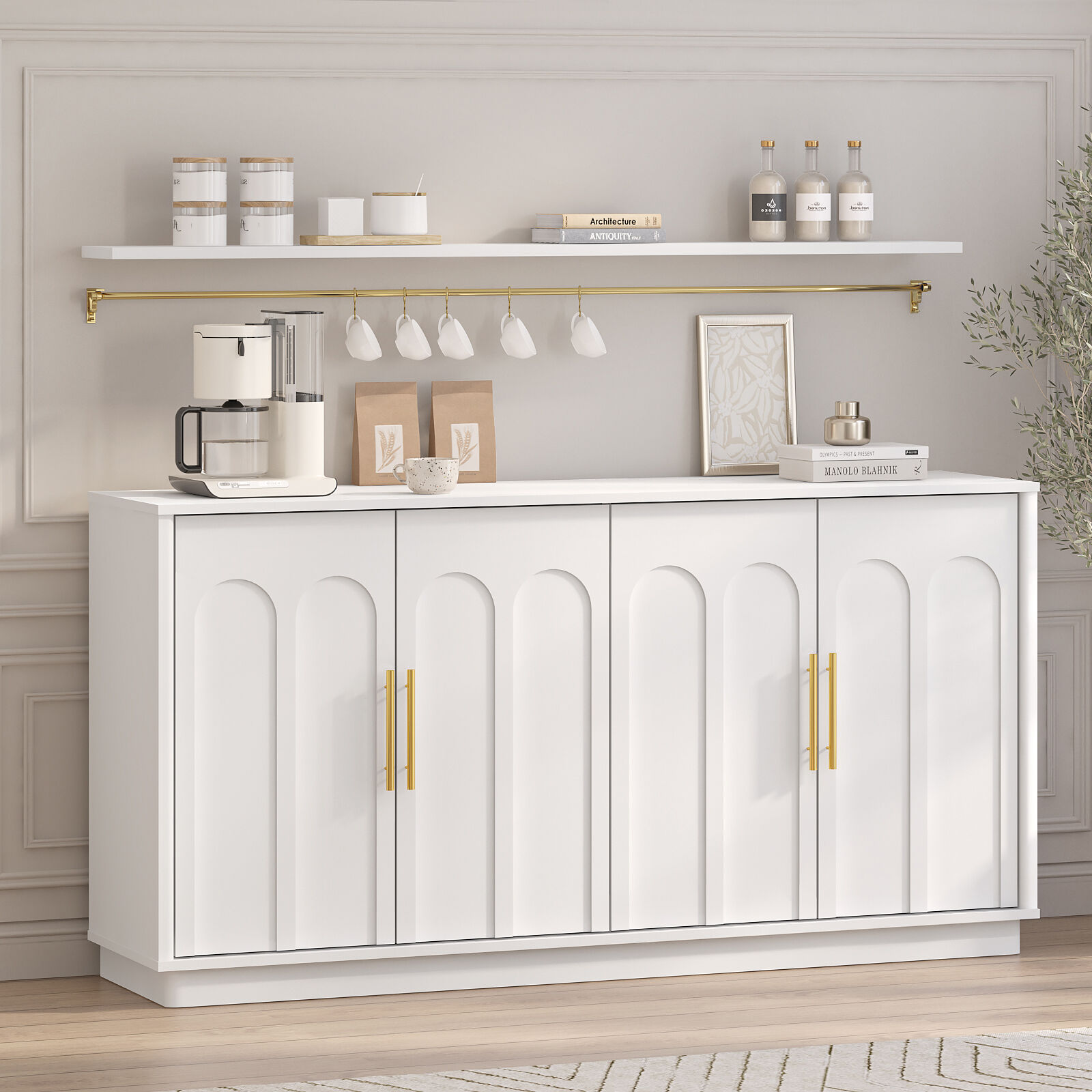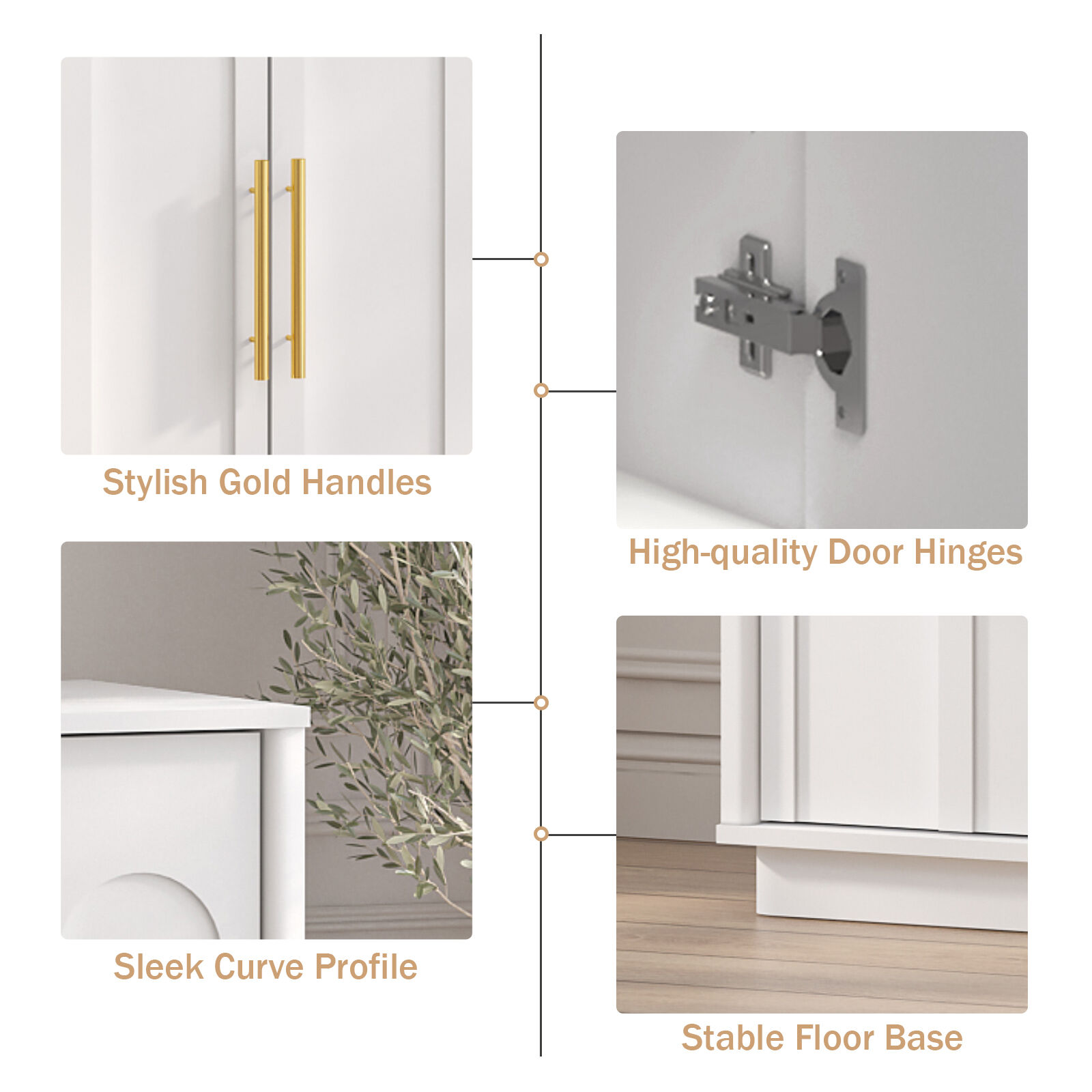 The design of this buffet sideboard is both sophisticated and user-friendly. Notably, the bottom of this buffet sideboard is equipped with a slightly protruding base, which not only enhances stability (essential for supporting tableware, linens, or decorative items often stored in a buffet sideboard) but also adds a sense of layering to the overall appearance. The multiple cabinet doors of the buffet sideboard are embellished with soft arched shapes, breaking the monotony of straight lines. Paired with long golden handles, they form a striking contrast with the white cabinet body, elevating the sense of delicacy while exuding a faint touch of light luxury—perfect for elevating the ambiance of spaces where the buffet sideboard resides, such as dining areas or entryways, thus creating a warm and stylish space atmosphere. When you open the cabinet doors of the buffet sideboard, you will find adjustable shelves inside. These shelves are cleverly designed to allow you to customize the size of the storage space at will, catering to the storage needs of different items commonly kept in a buffet sideboard, such as dinner plates, serving bowls, tablecloths, or even small kitchen gadgets.​